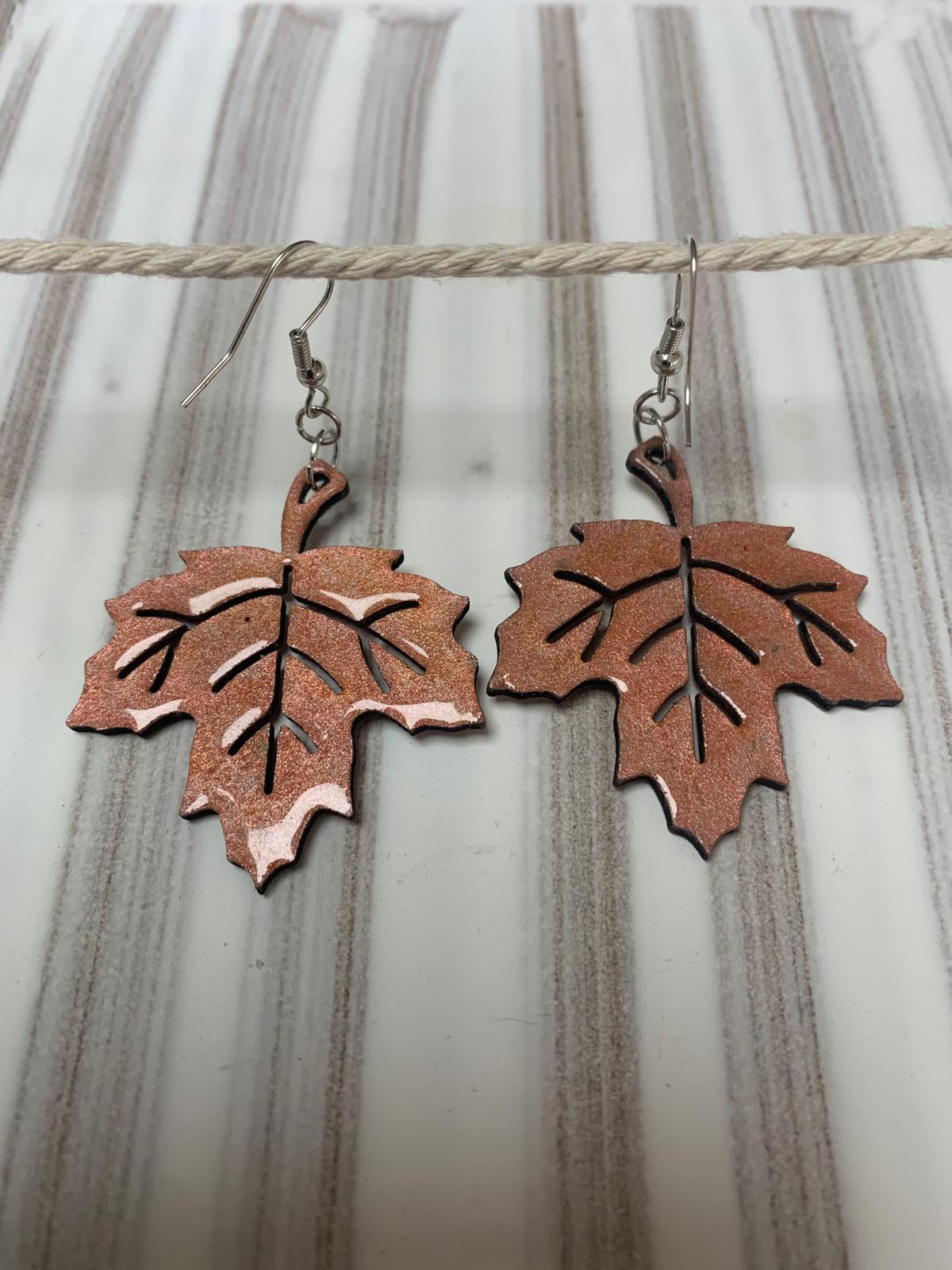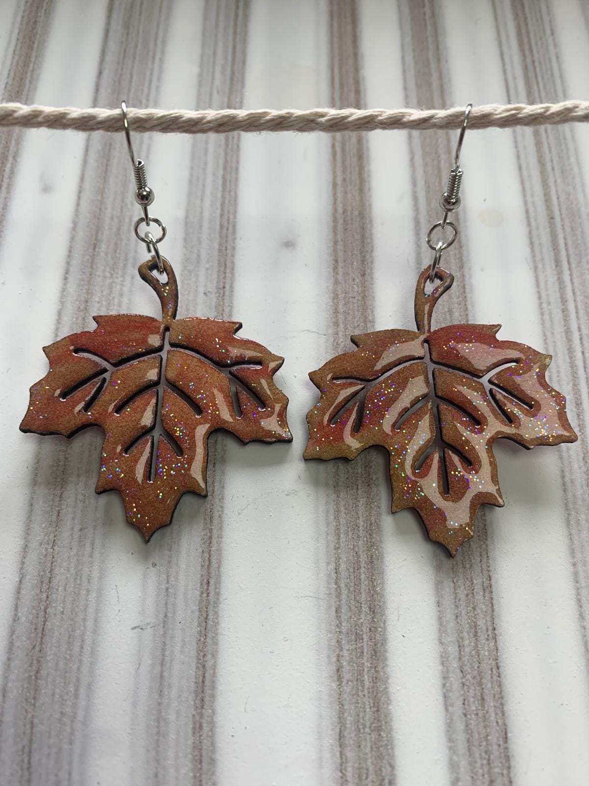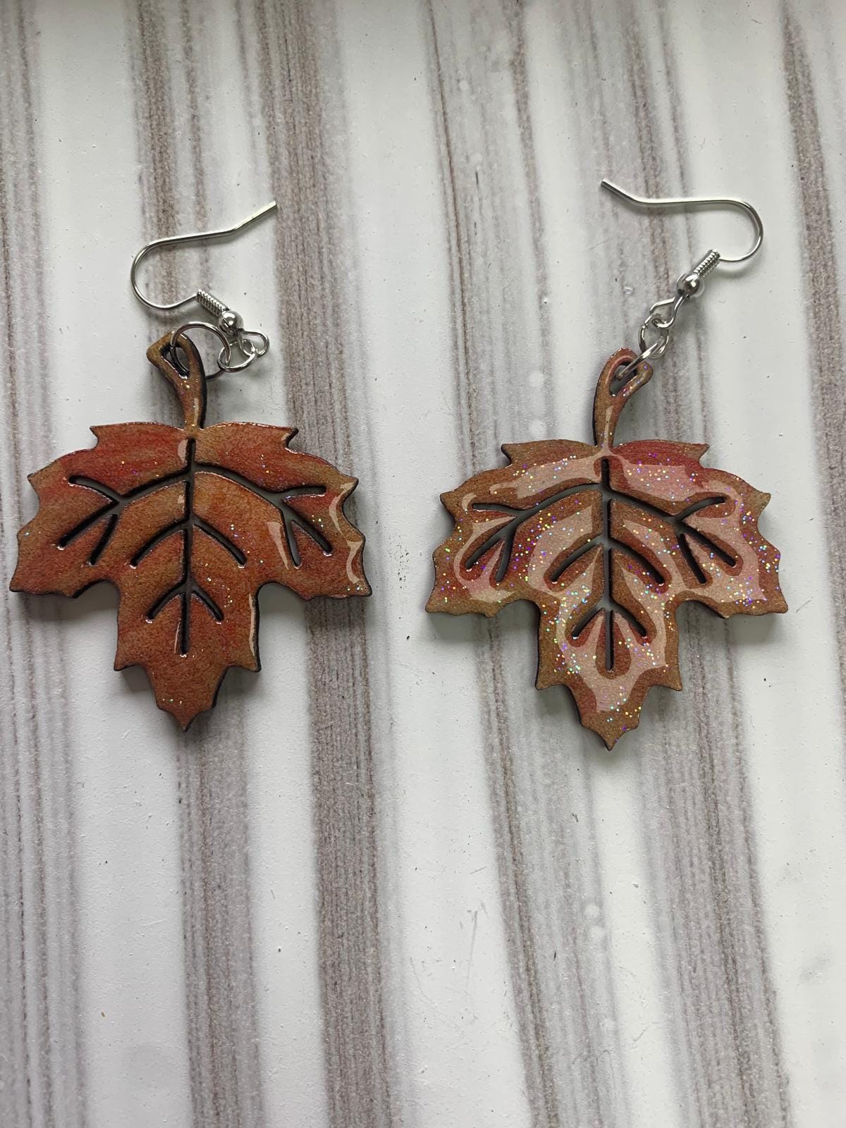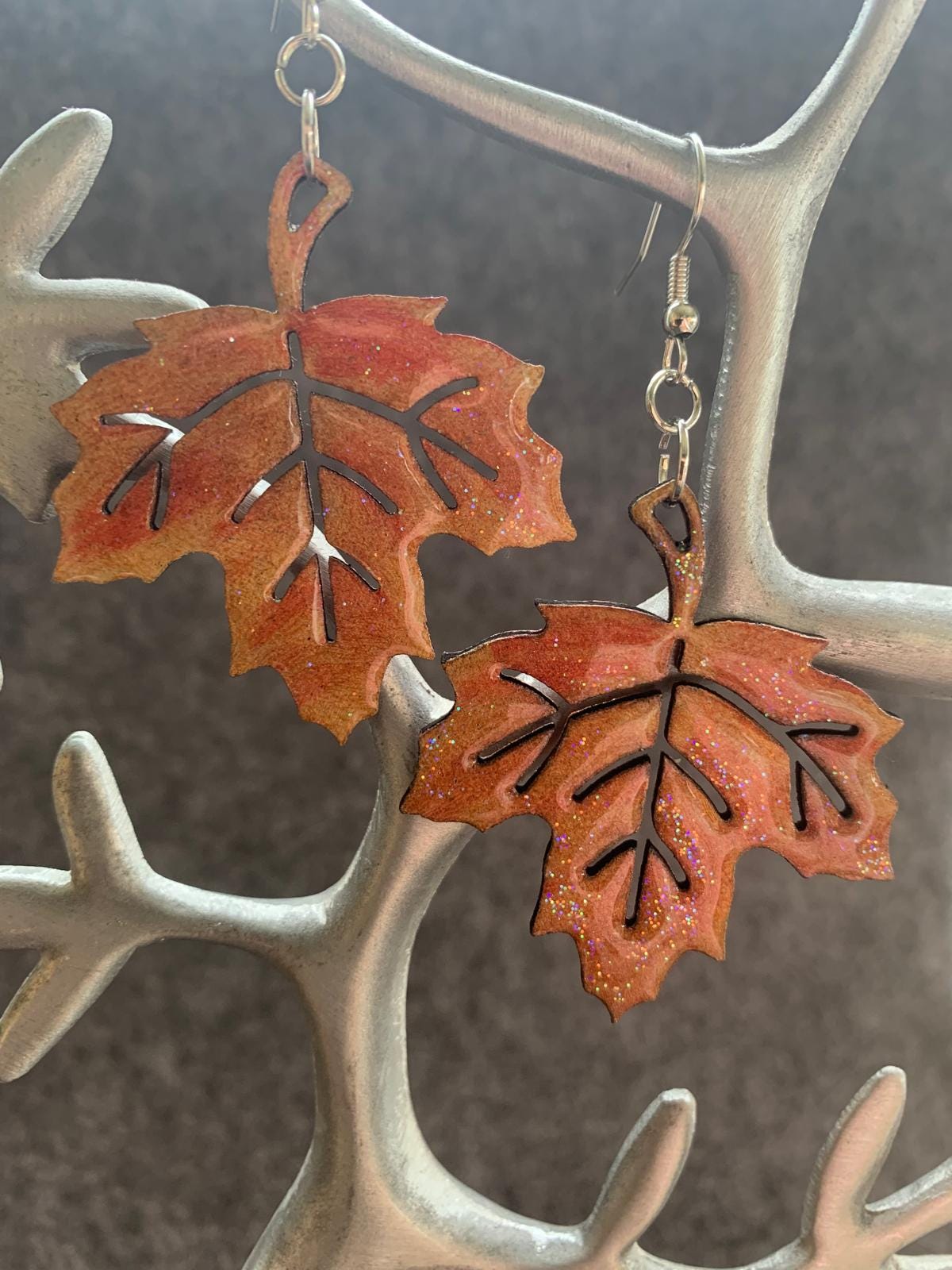 Beautiful, unusual maple-shaped earrings. My own creation. The earrings are handcrafted on both sides. They shimmer differently depending on the light. Beautiful natural jewelry/autumn fashion in a maple leaf design.