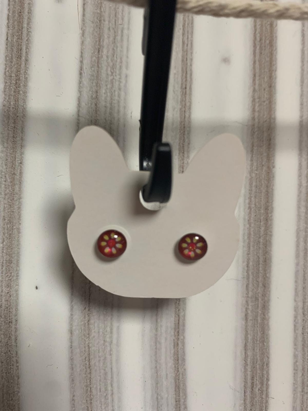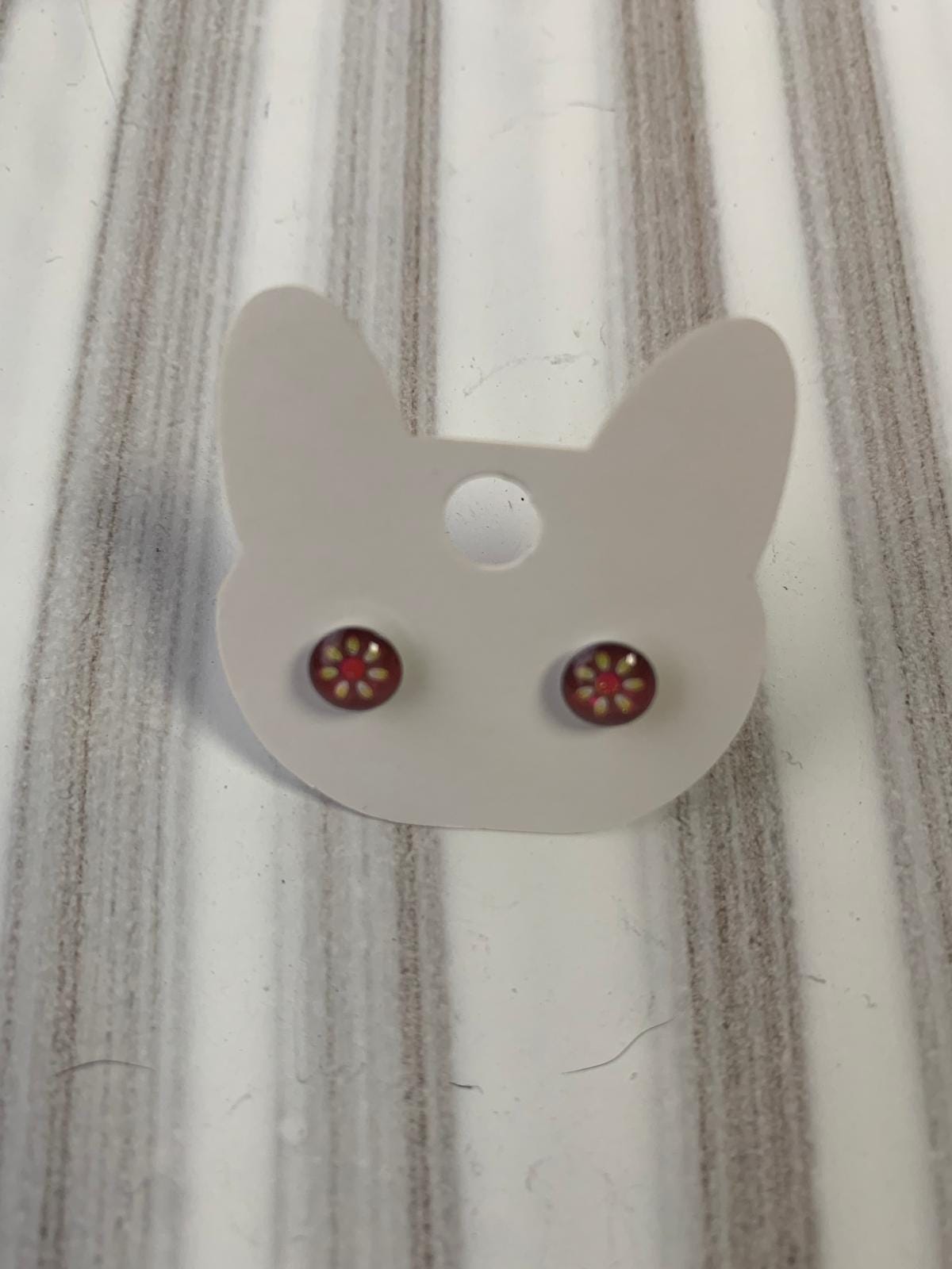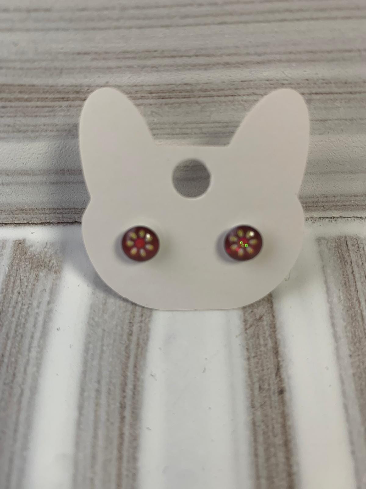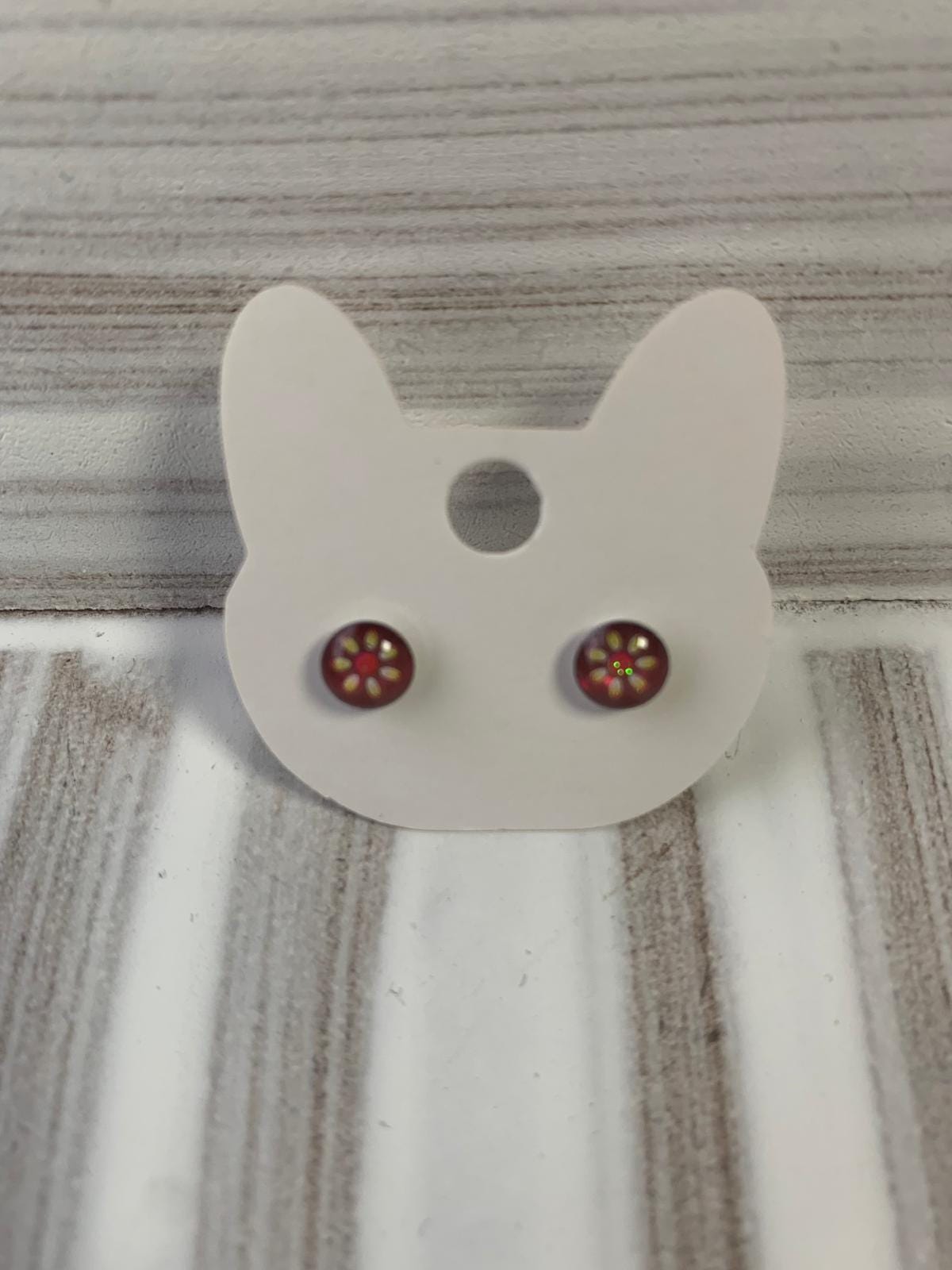 Handmade stud earrings with a red flower design. Resin and metal setting.