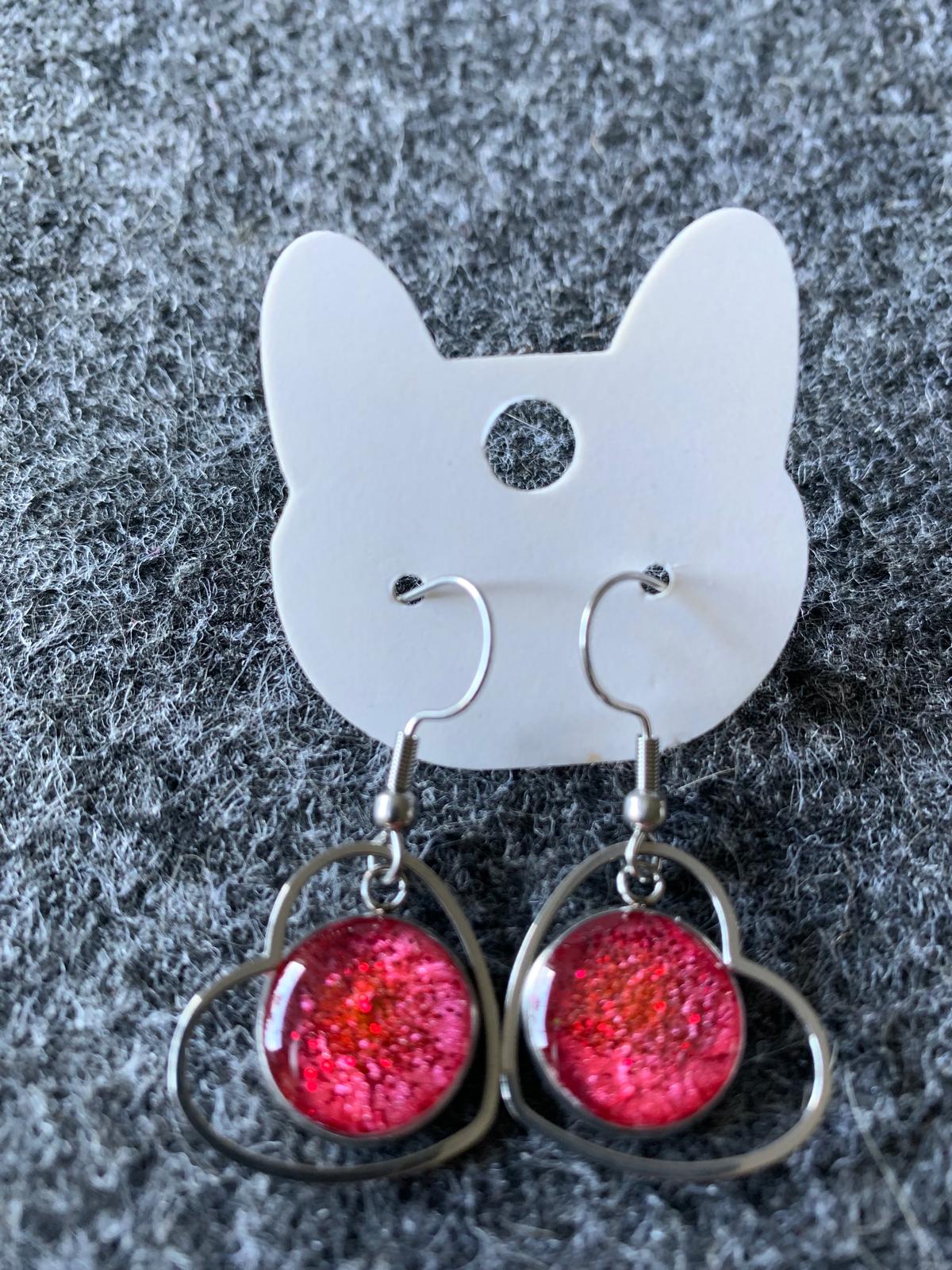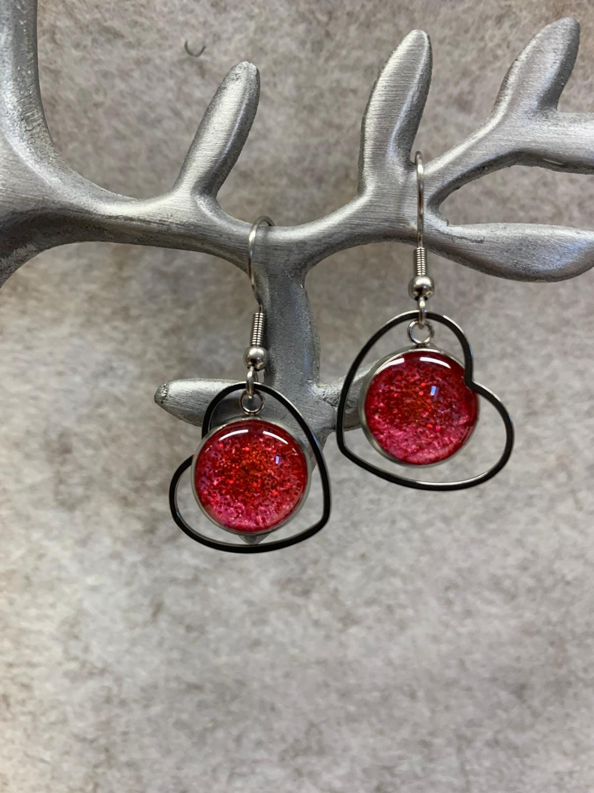 Handmade resin earrings with a round metal heart. Glittering red, metal setting, 4 cm. Elegant statement jewelry.