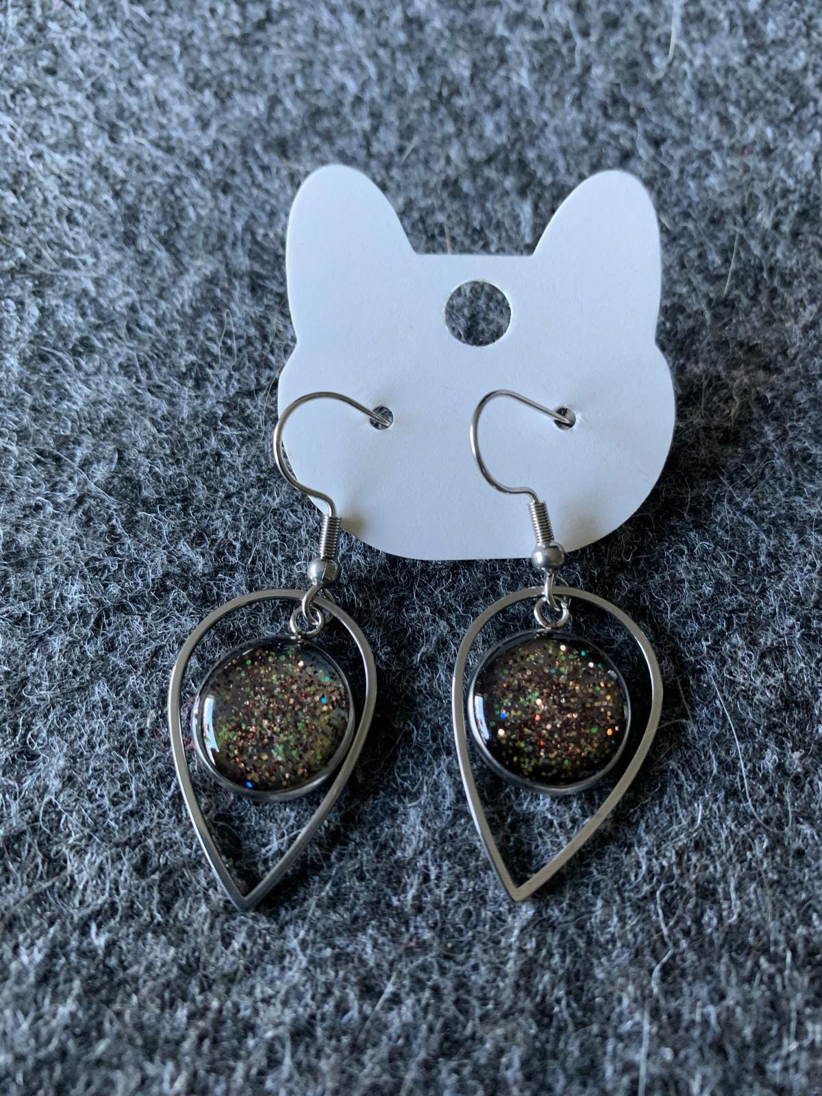 These unique earrings are a real eye-catcher. Handcrafted from high-quality resin with sparkling dark brown accents, set in an elegant metal frame. The round shape lends them a timeless elegance, while the glittering surface provides a modern, eye-catching finish. Measuring approximately 4.5 cm in length including the drop, they are perfect for special occasions or as a stylish everyday accessory.