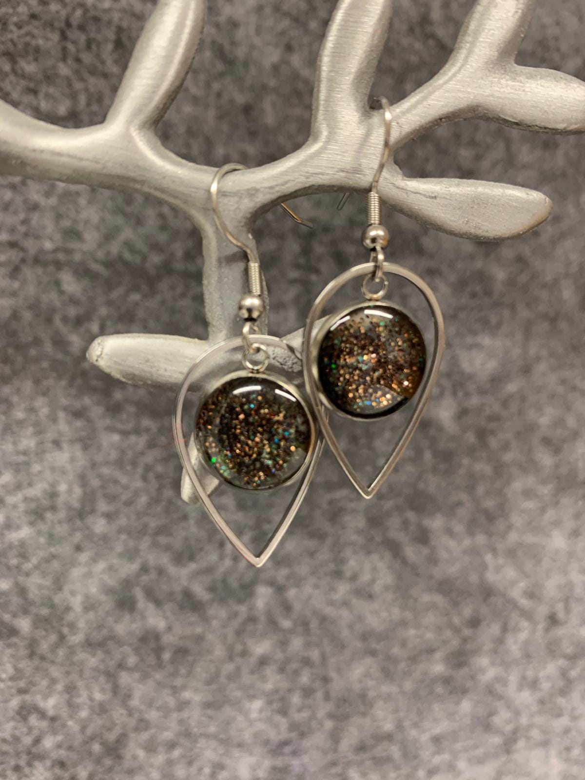 Handmade resin earrings with round metal drops. Dark brown glitter, metal setting, 4.5 cm. Elegant statement jewelry.