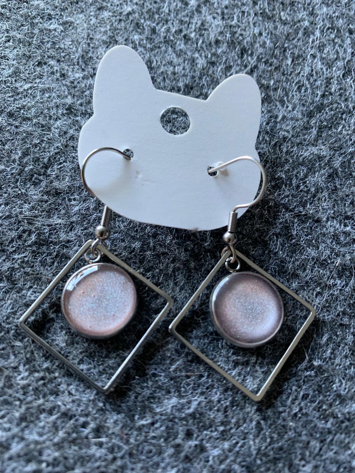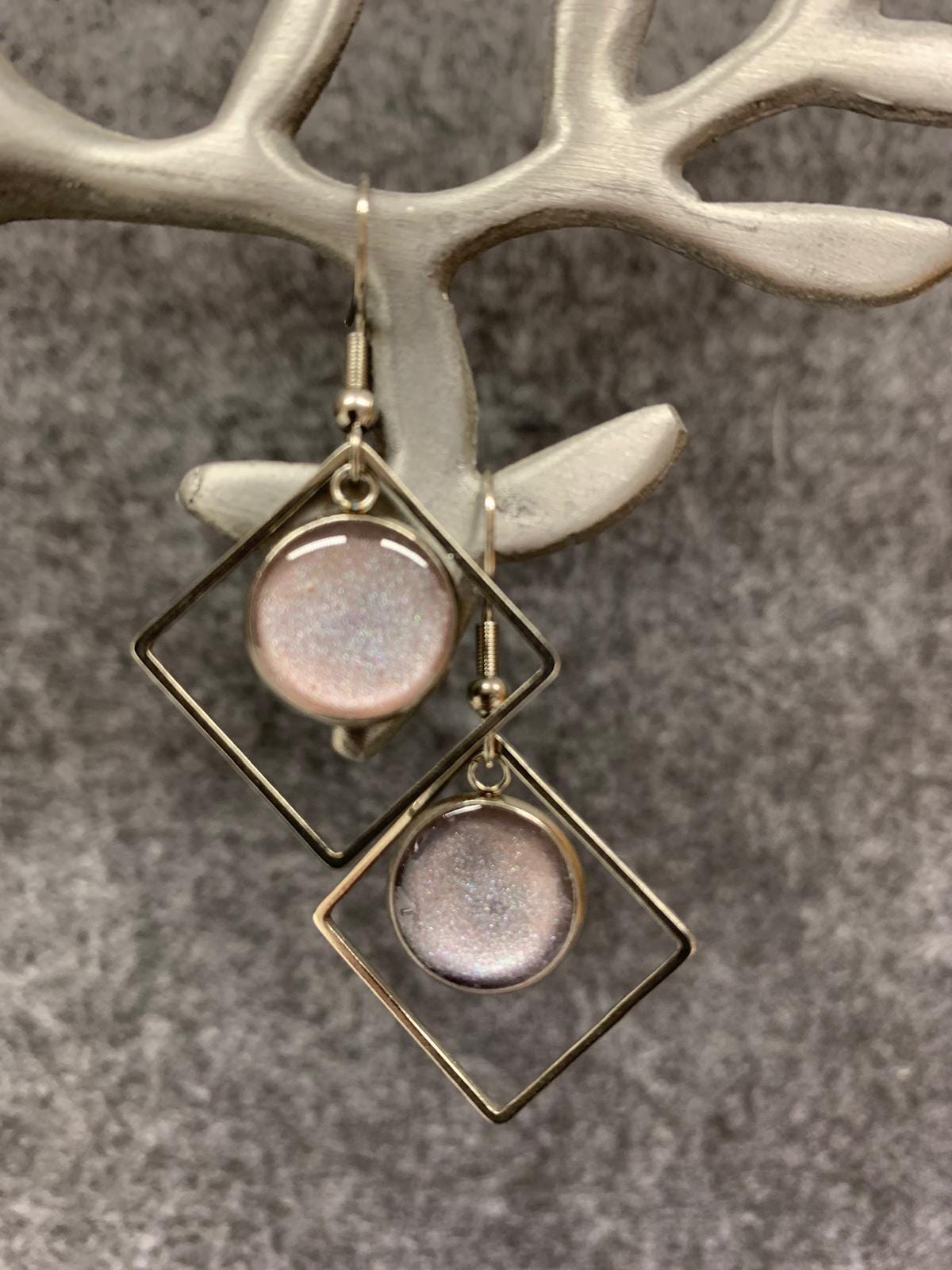 Handmade resin earrings, round and square in metal. Soft pink, glittery, metal setting, 4 cm. Elegant statement jewelry.
