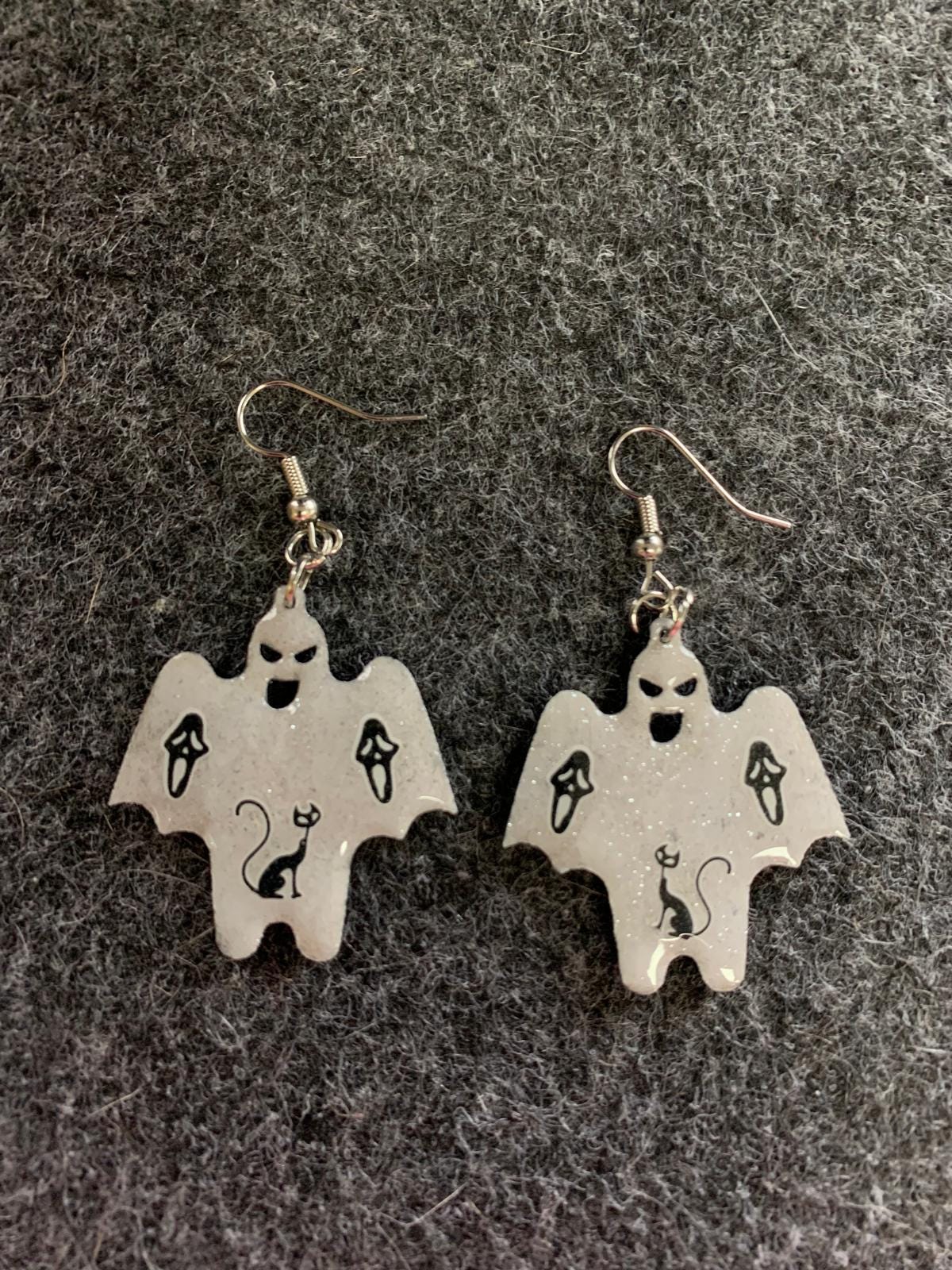 These handmade Halloween earrings are the perfect accessory for those who love a dark and stylish look. The unusual, shimmering ghost motif made of wood and resin creates a striking look. Ideal for Halloween, festivals, or everyday wear with a touch of gothic.