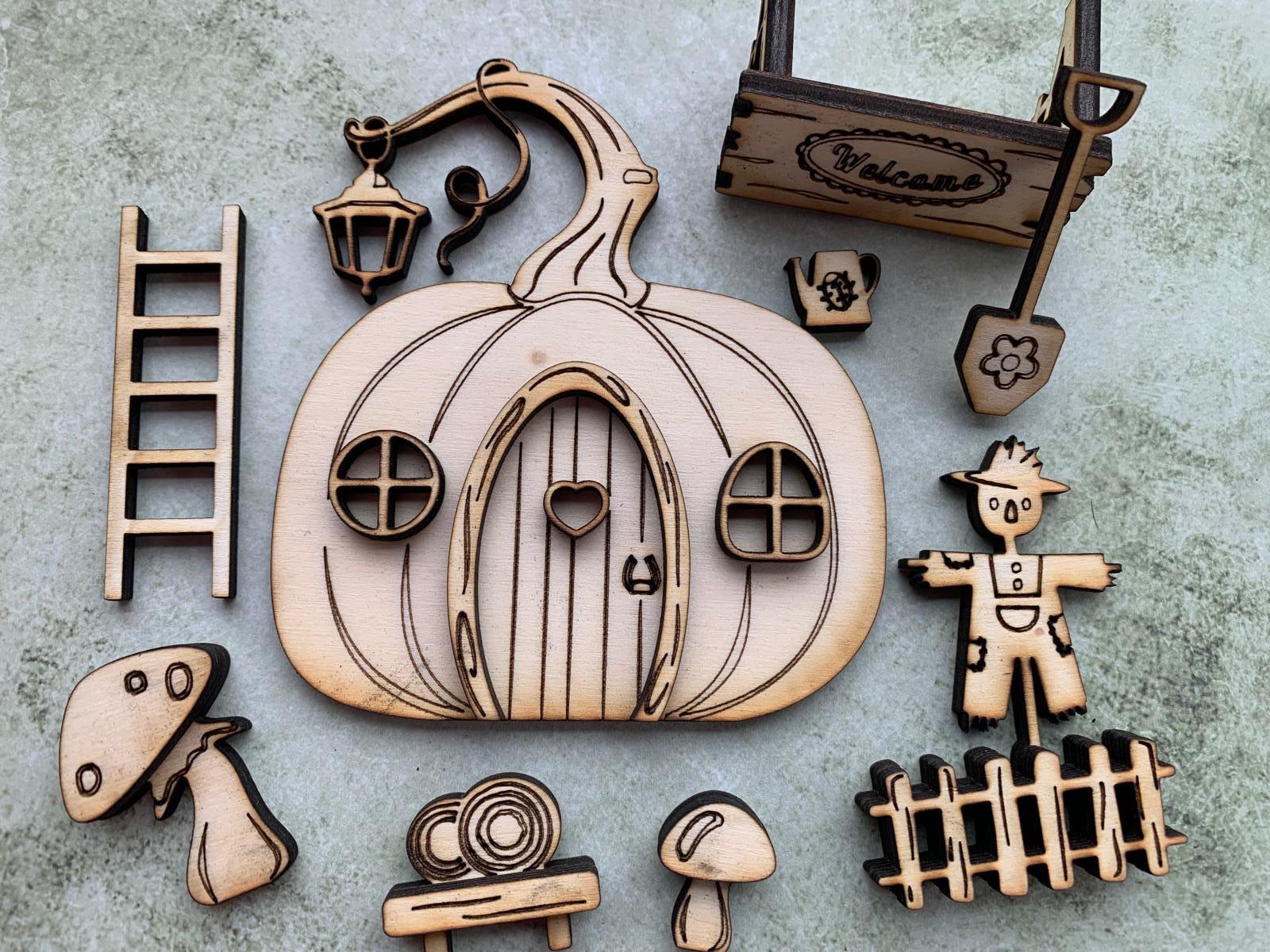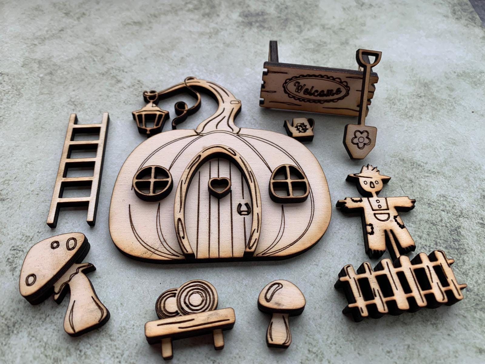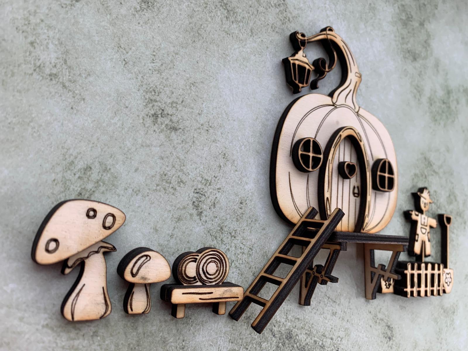 The set consists of a detailed mini door with matching accessories such as a scarecrow with a fence, mushrooms, a ladder, and small decorations. Perfect for creating a mysterious entrance door for your gnome or fairy.