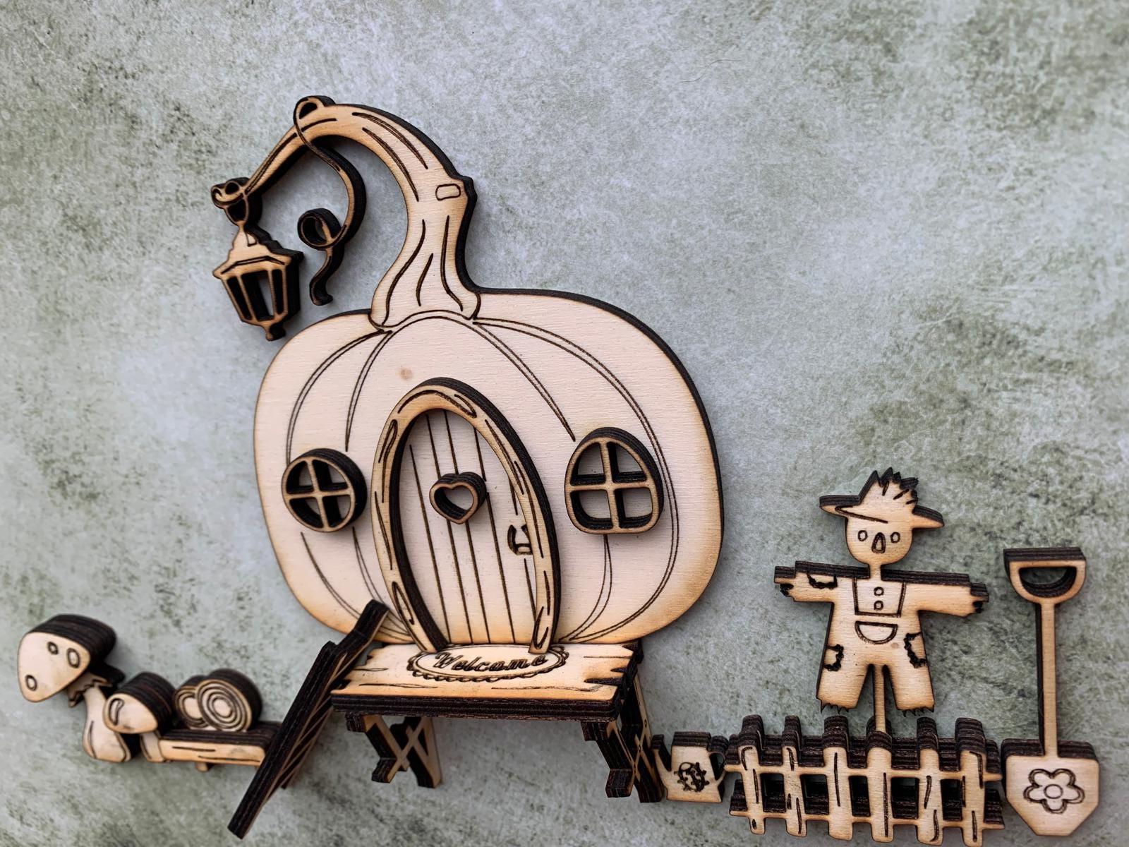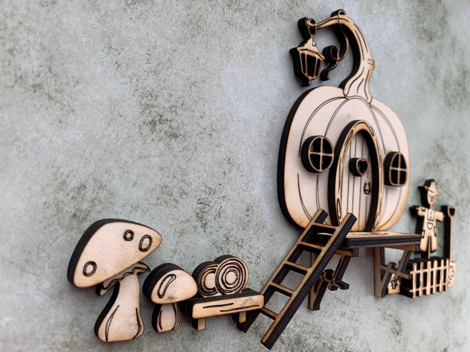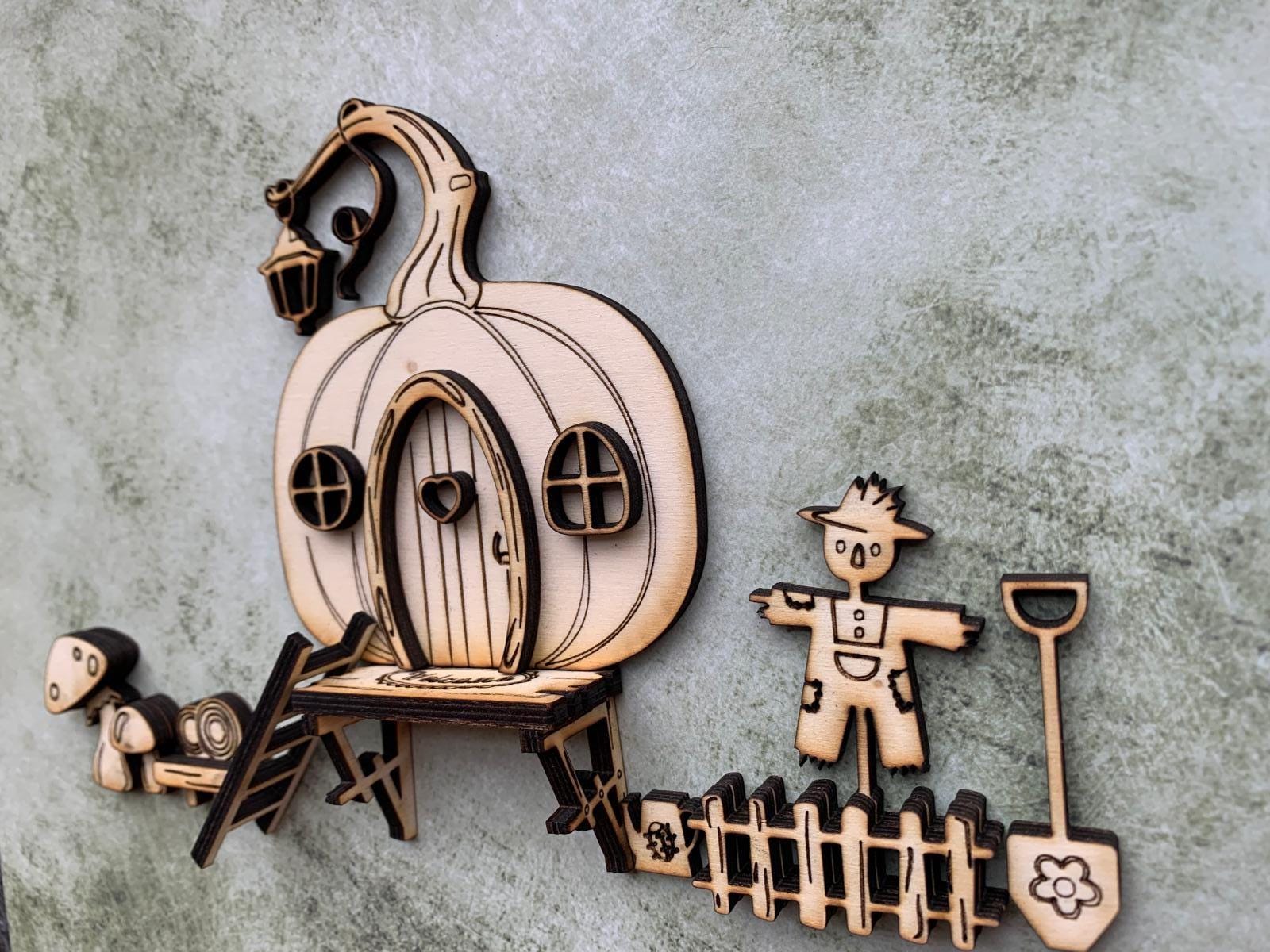 The set consists of a detailed mini door with matching accessories such as a scarecrow with a fence, mushrooms, a ladder, and small decorations. Perfect for creating a mysterious entrance door for your gnome or fairy.
