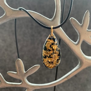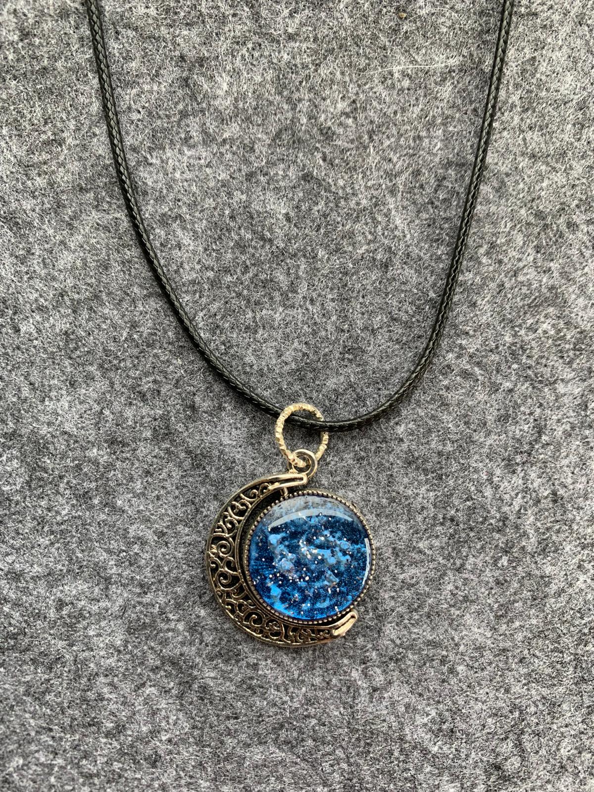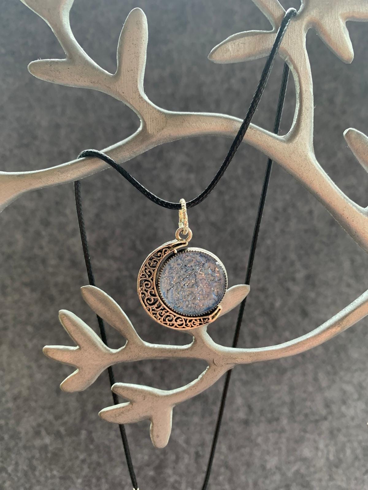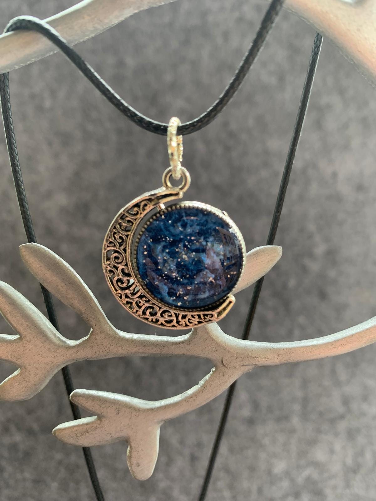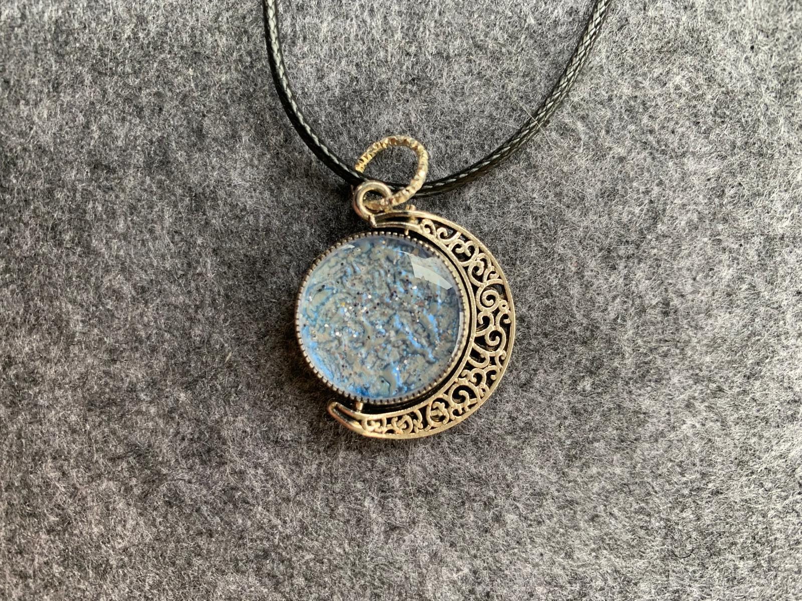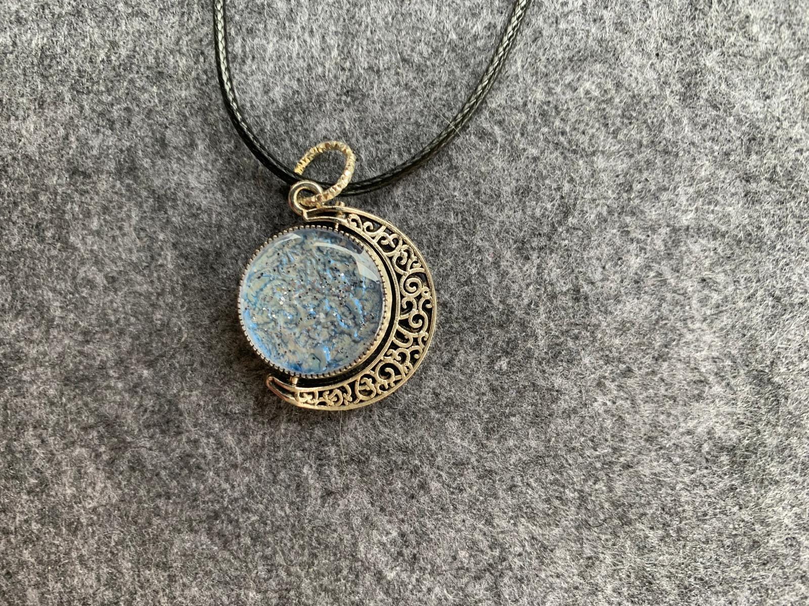 Handmade resin pendant with glitter, rotating moon pendant in dark and light blue with faux leather chain, silver-colored metal setting.
