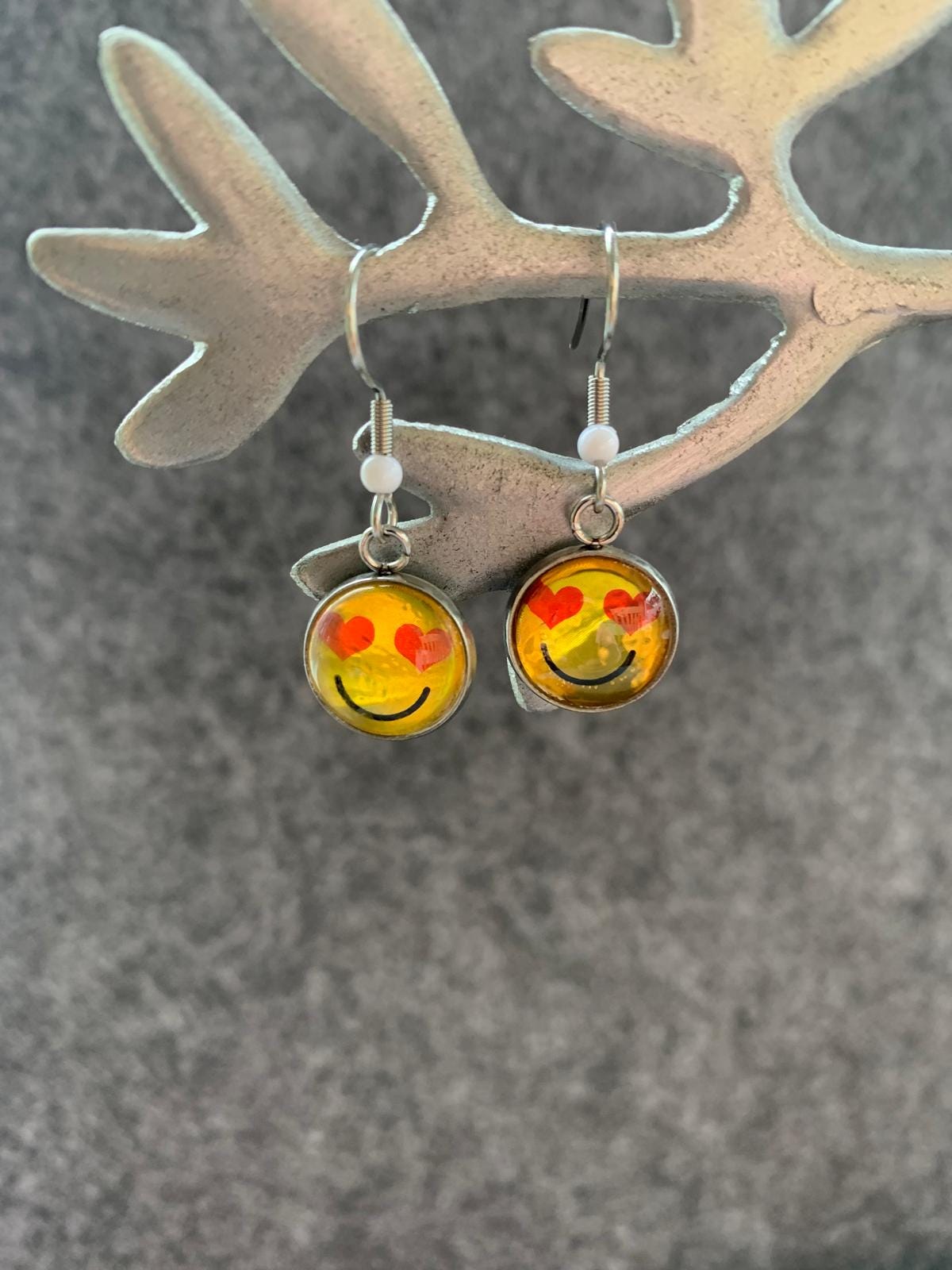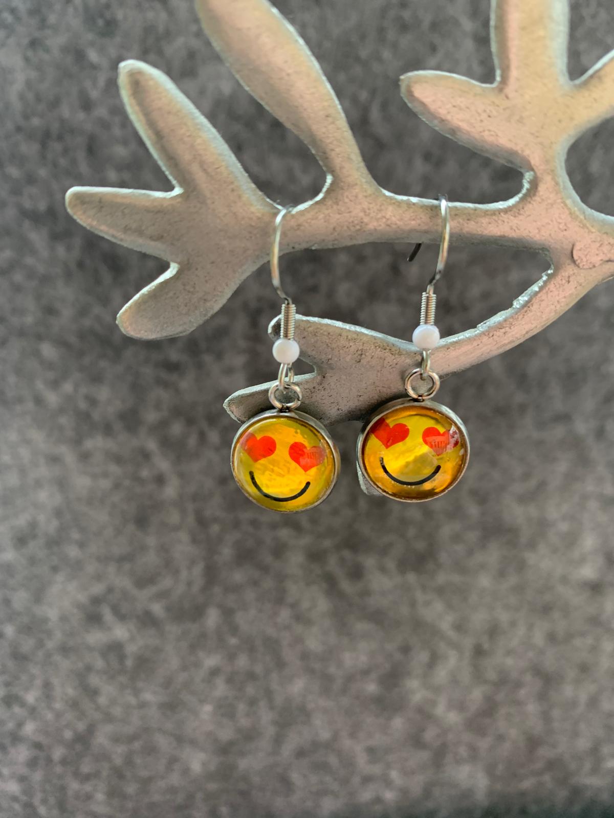Bring color and joy to your everyday life with these handmade smiley-face earrings! The round resin elements shimmer in warm tones like yellow, orange, and red depending on the light. Encased in an elegant metal setting and decorated with a minimalist smiley-face foil, they're a real eye-catcher for any outfit.