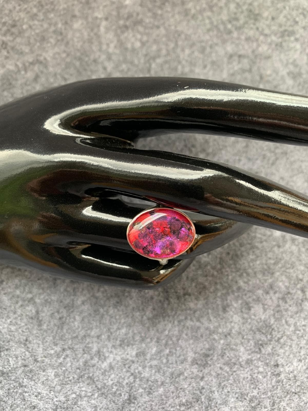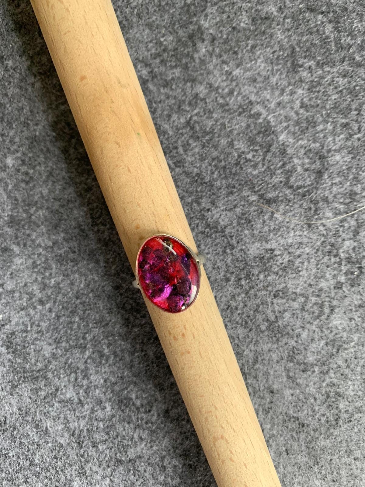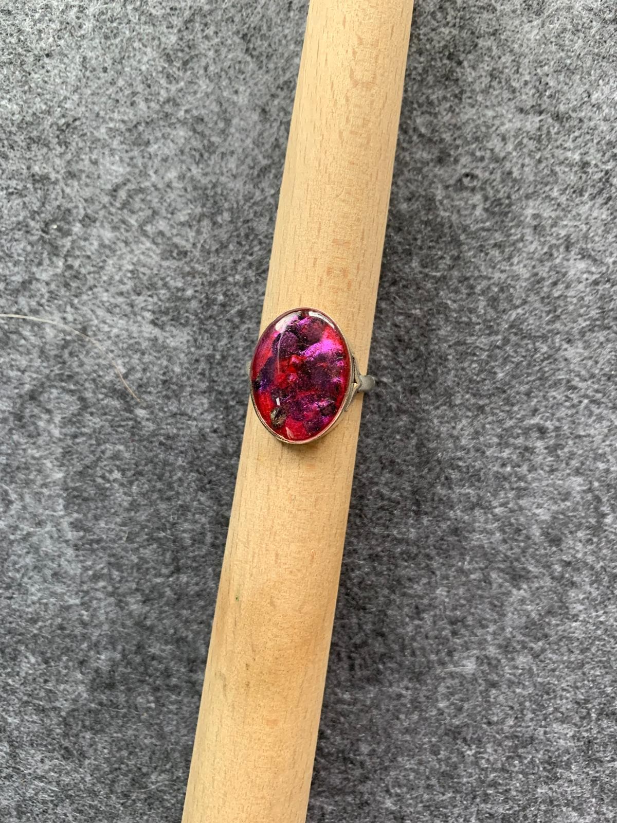 A self-designed silver-colored ring with red resin and glitter. Elegant jewelry. Inner diameter 18 cm. Resin ring.