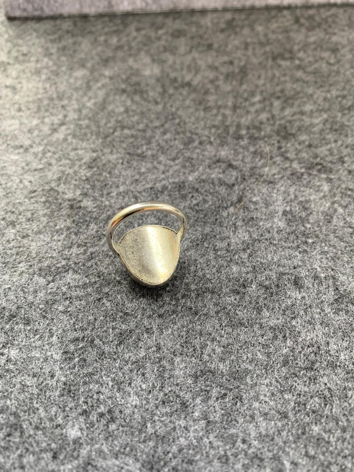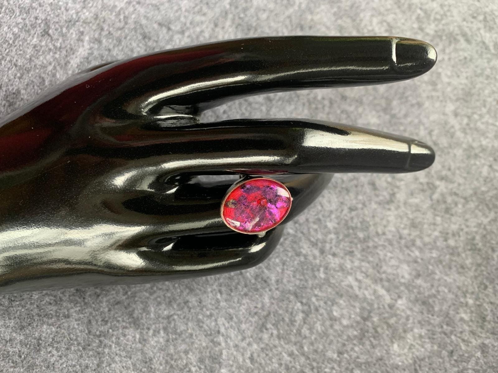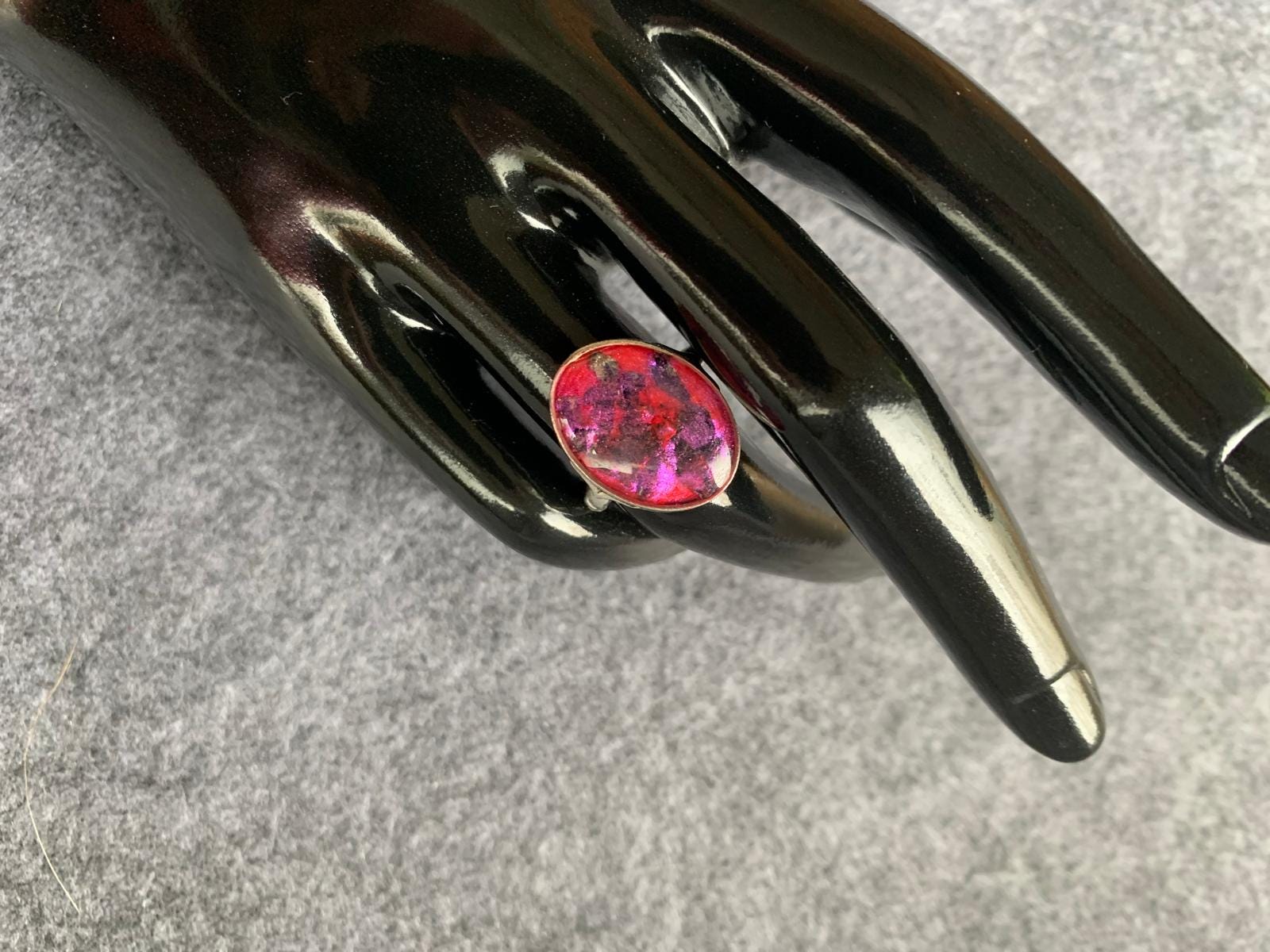 A self-designed silver-colored ring with red resin and glitter. Elegant jewelry. Inner diameter 18 cm. Resin ring.