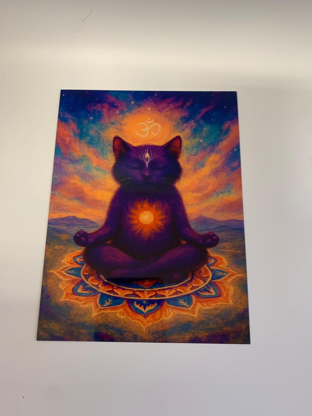 This beautiful aluminum sign depicts a meditating cat in vibrant colors—a symbol of calm, mindfulness, and spiritual balance. The cat sits in the lotus position on a mandala flower, its glowing heart chakra radiating energy, while the Om symbol hovers above.