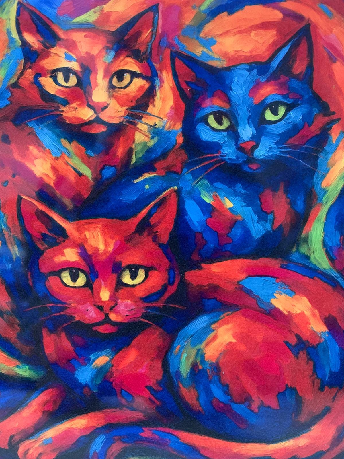 This high-quality metal sign depicts three cats in a striking abstract pop art style, characterized by bold colors such as red, blue, orange, and yellow. The artistic illustration lends a vibrant, modern atmosphere to any room and immediately draws attention with its intense color composition.
