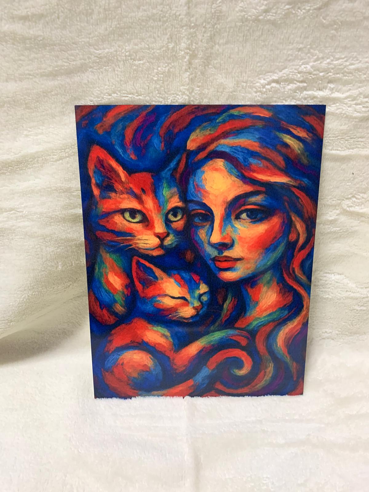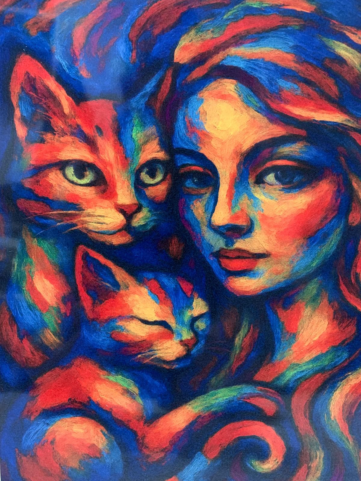 Colorful metal sign with abstract cats and a woman – Pop Art style • Wall decoration for cat lovers • Colorful metal picture 20×15 cm